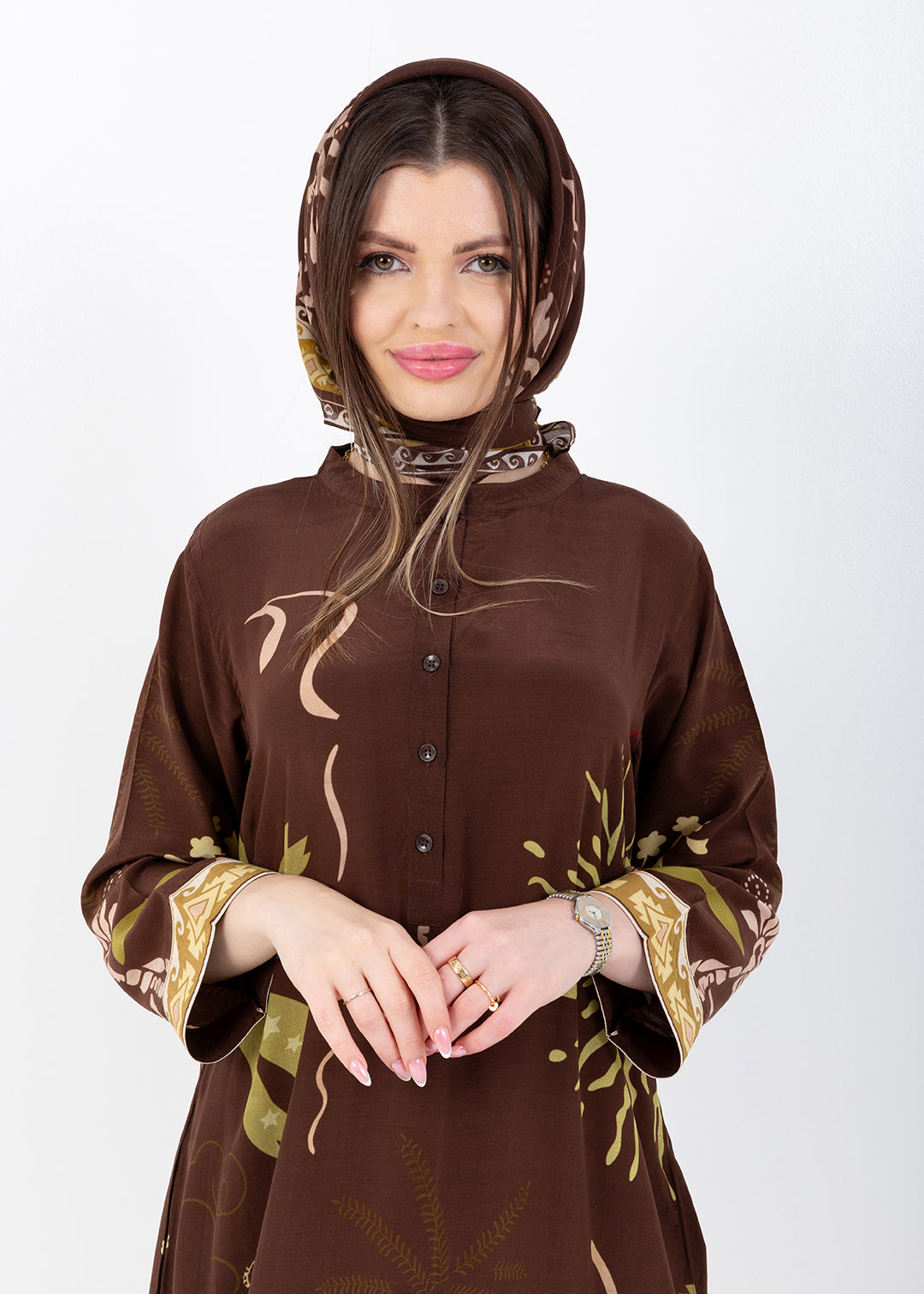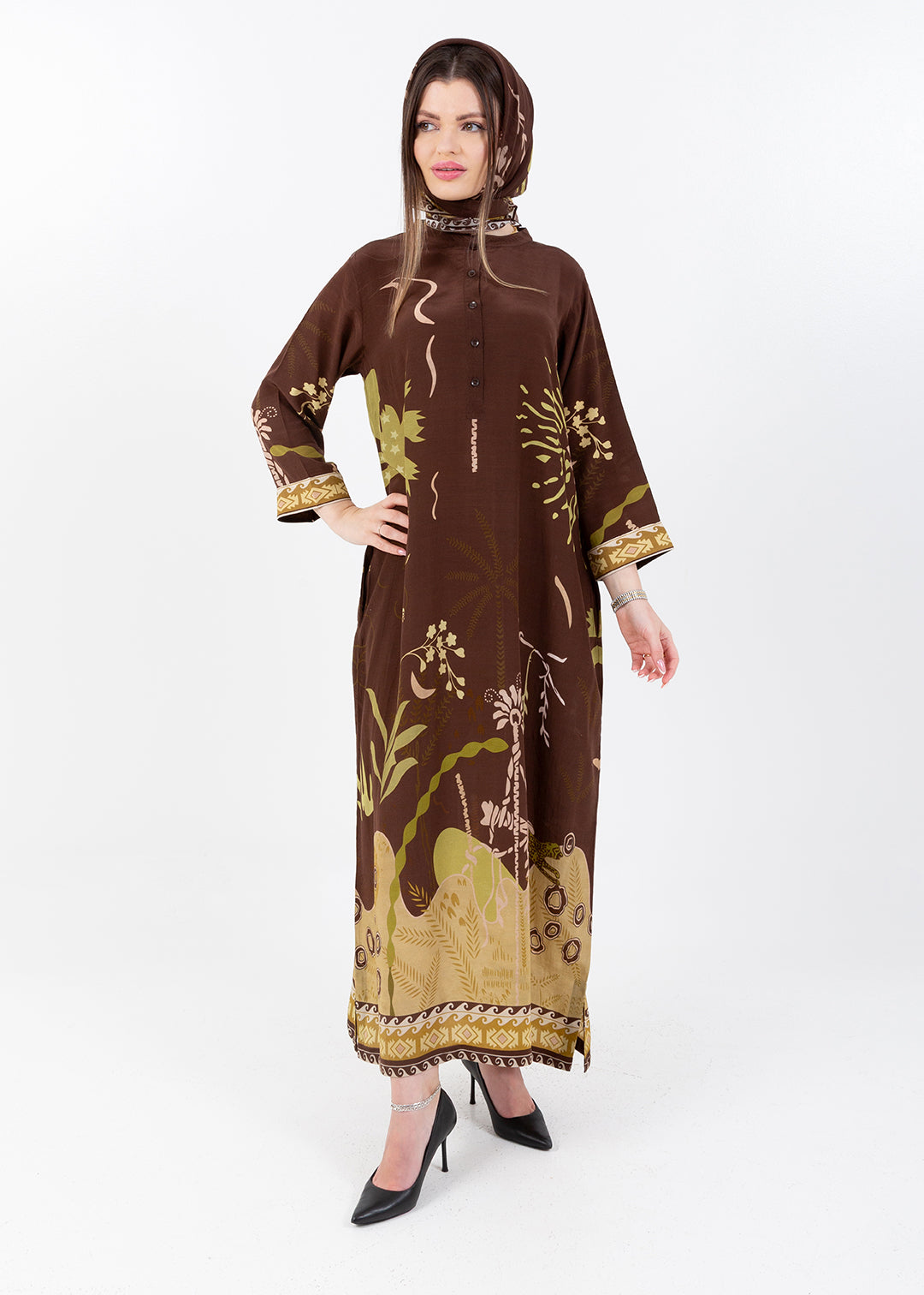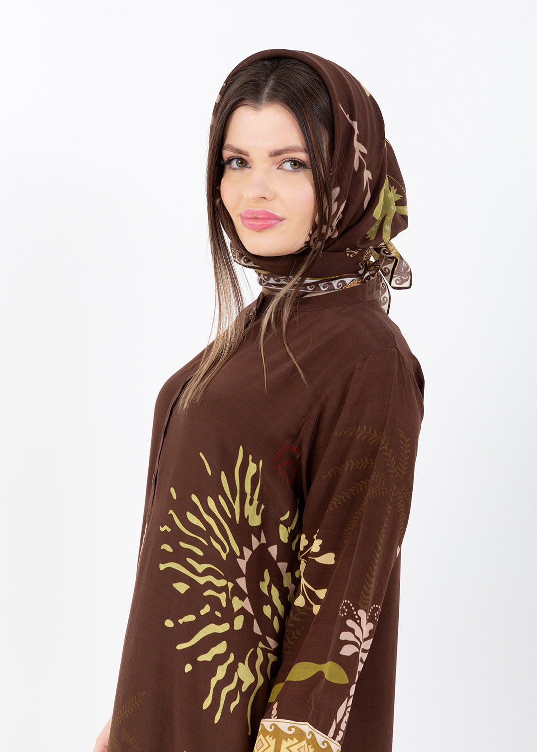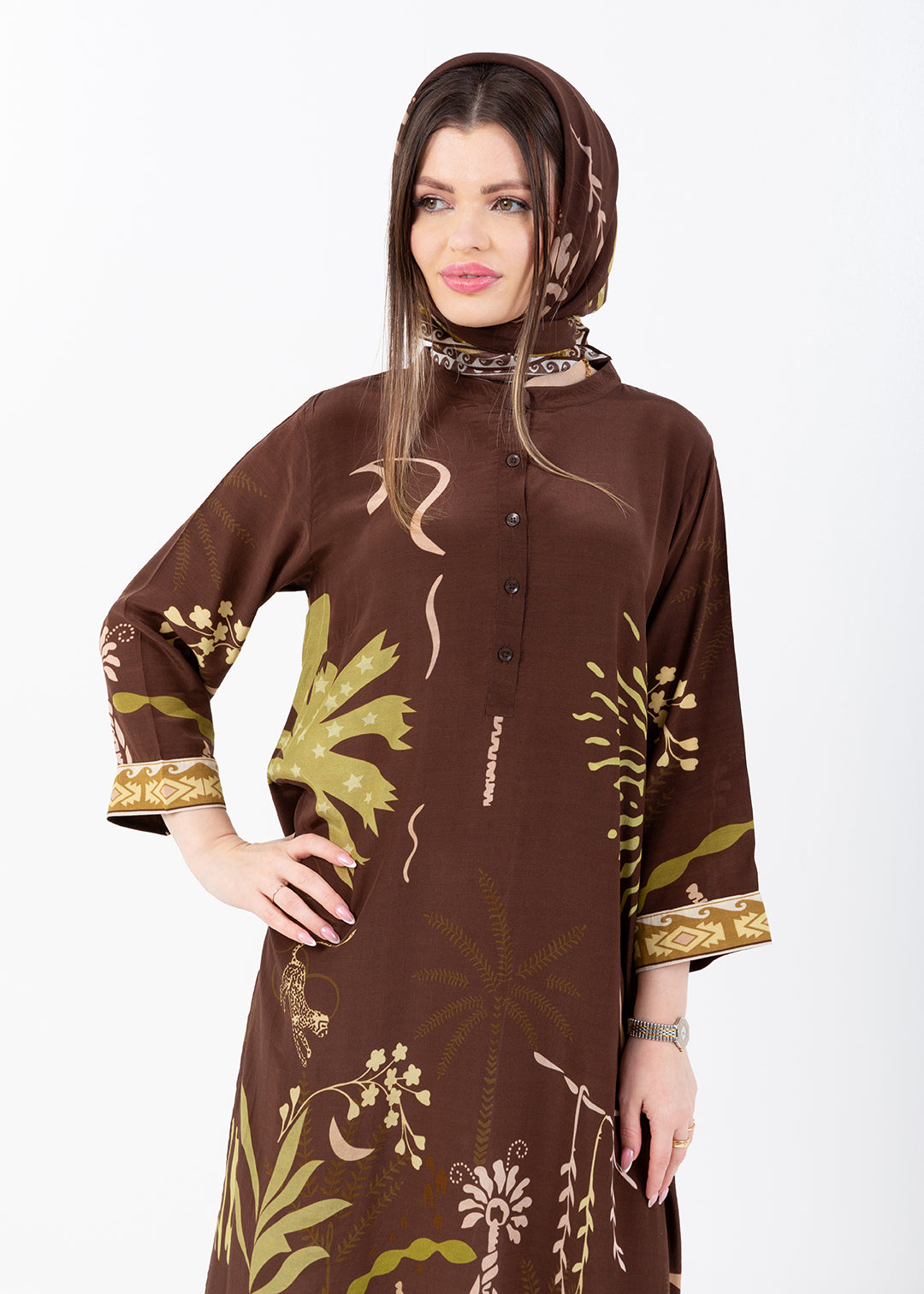 Nooré Brown Cupro Satin Kaftan Set with Matching Scarf