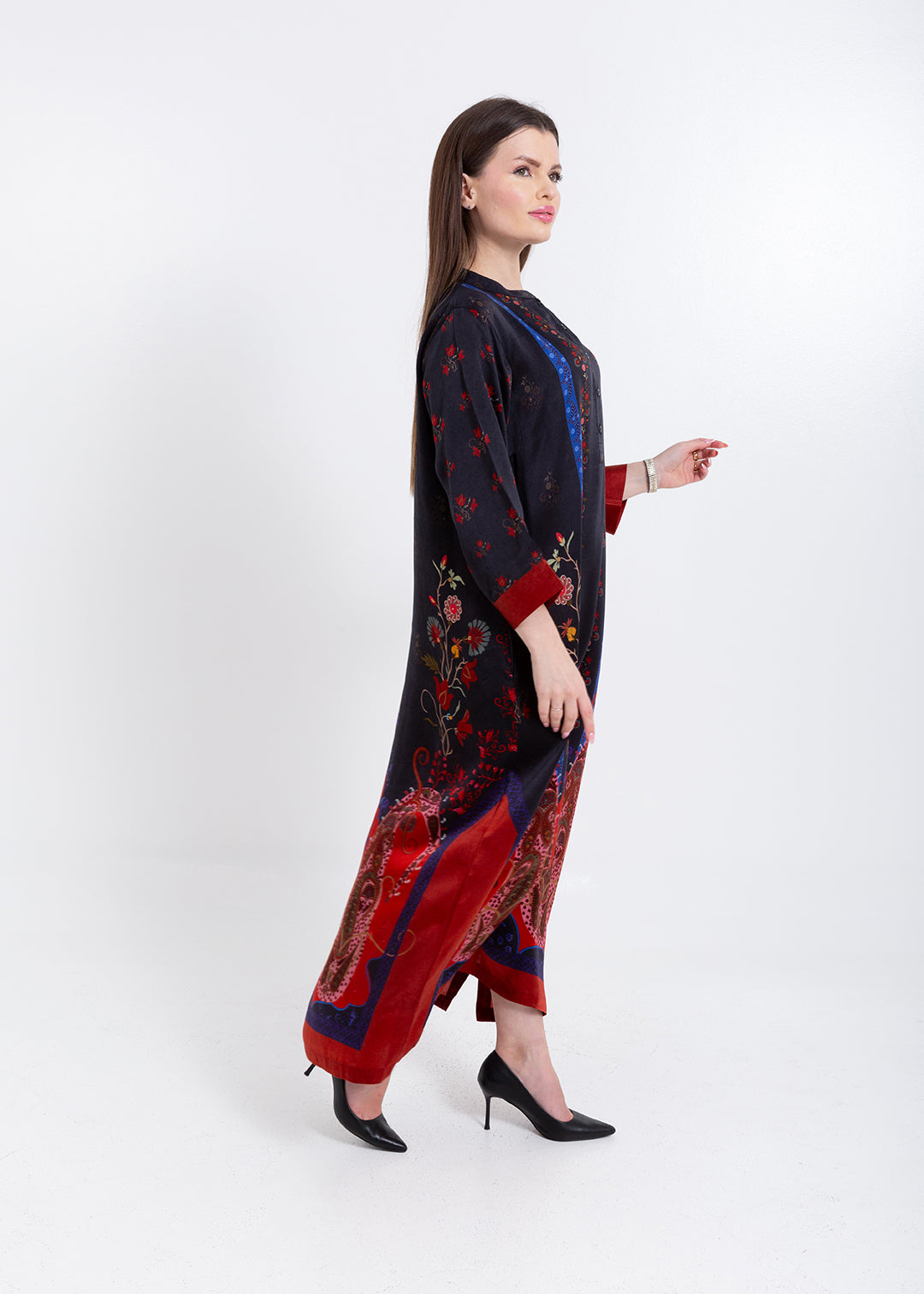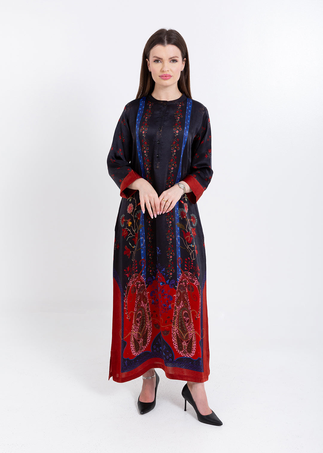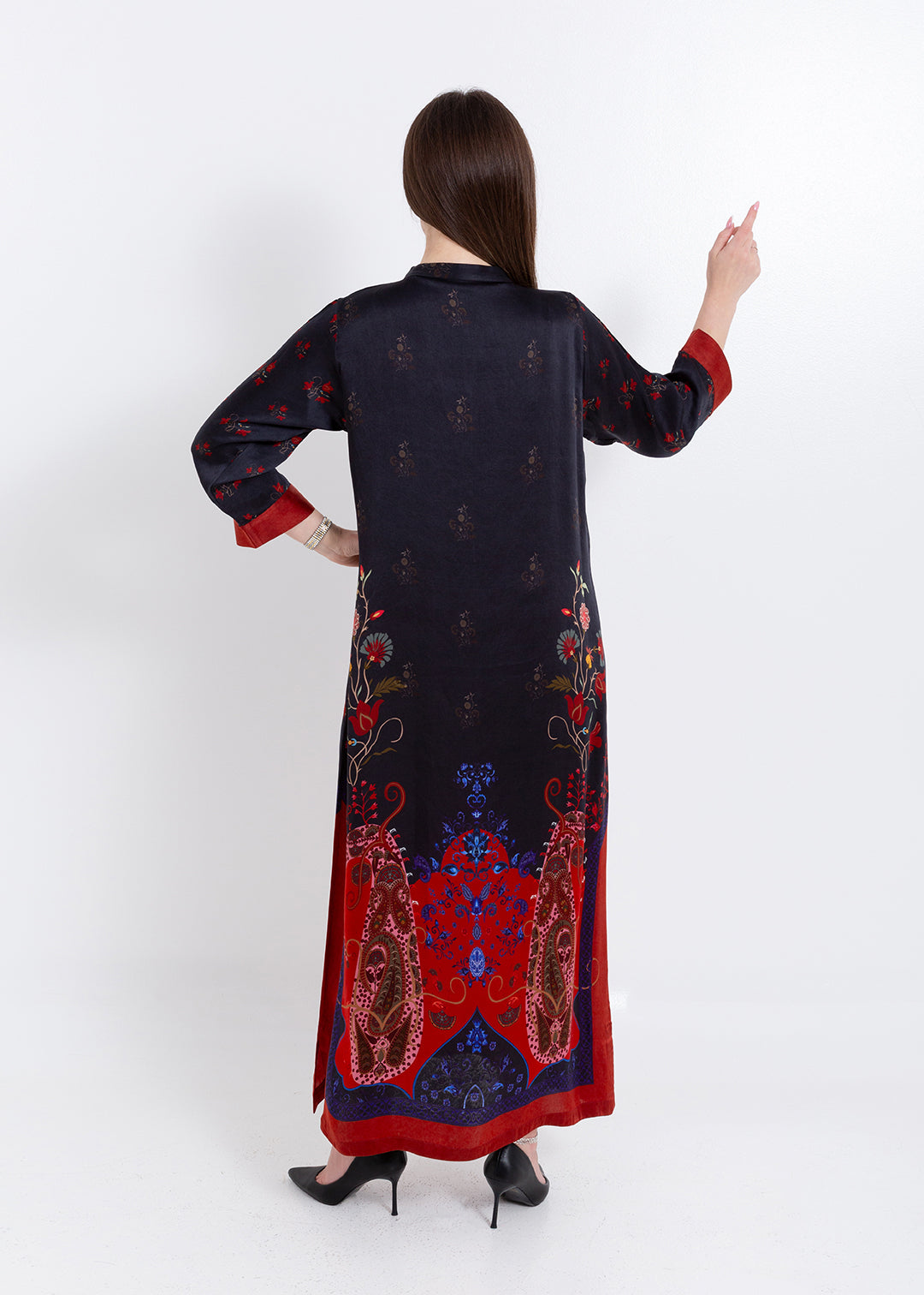 Product Description Elegant with a bold artistic touch, the Riyana Midnight Black Kaftan Set is crafted in luxurious Premium Cupro Satin, offering a...