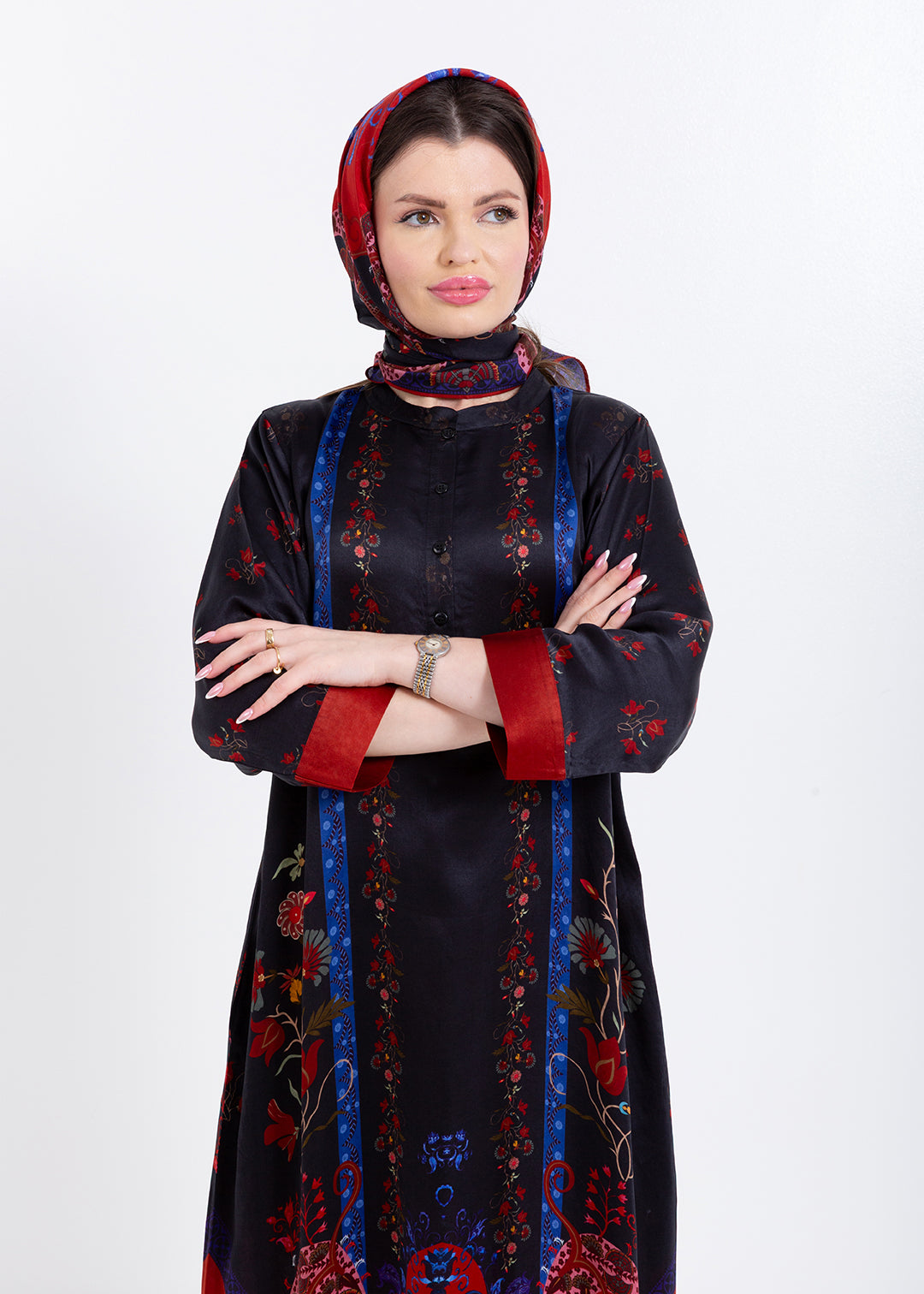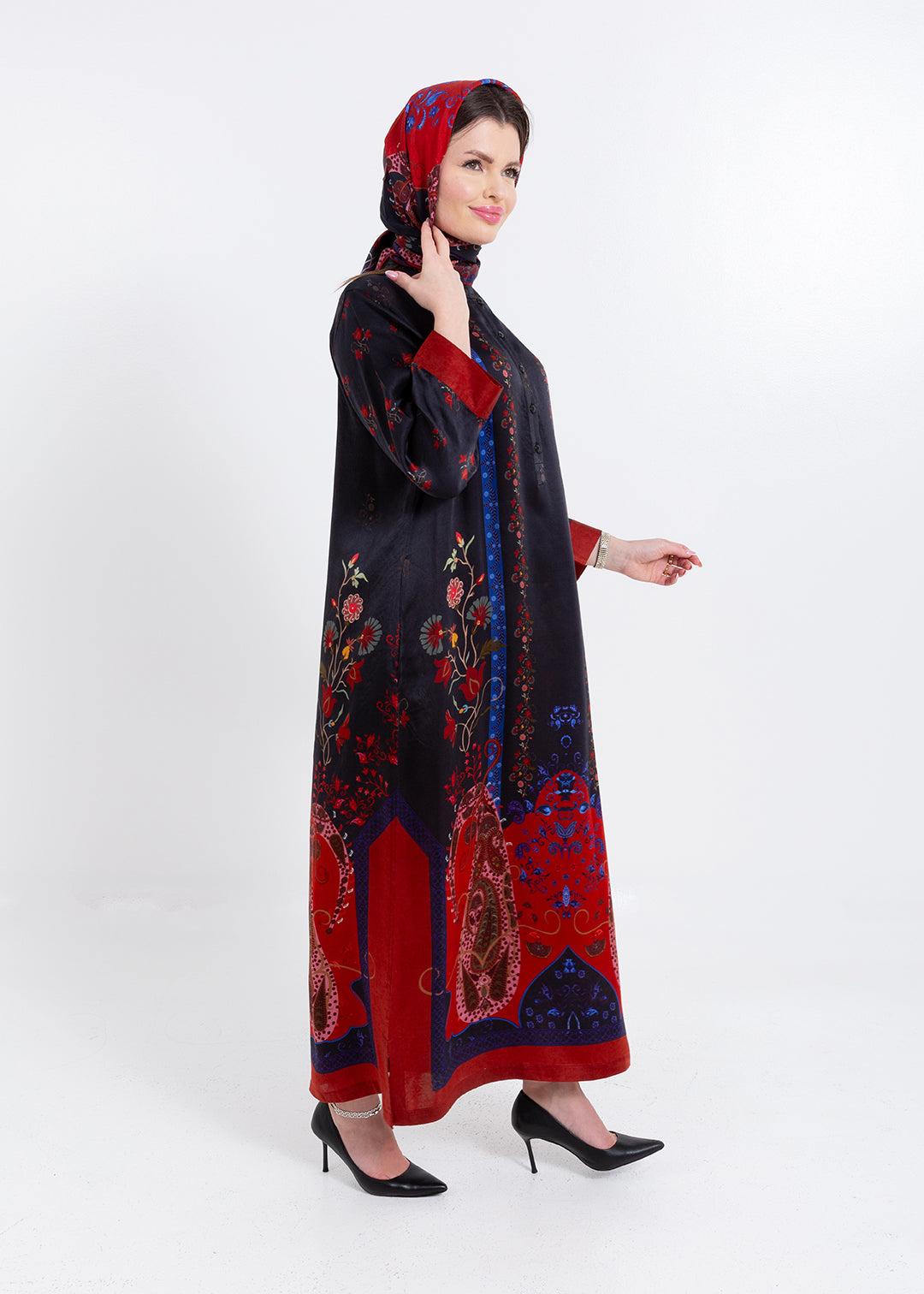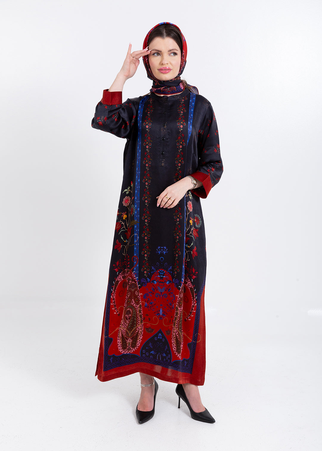 Riyana Midnight Black Cupro Satin Kaftan Set with Matching Scarf