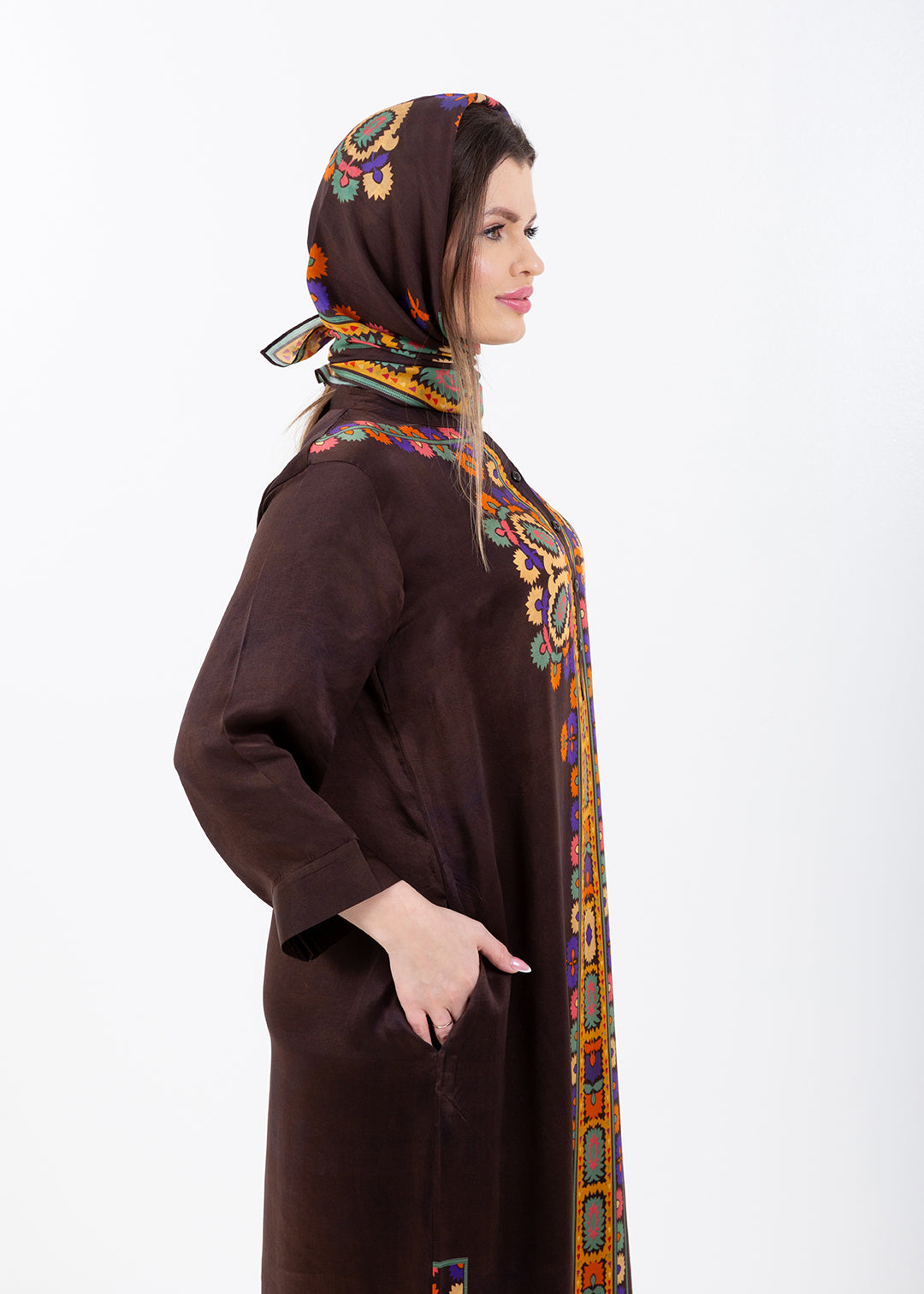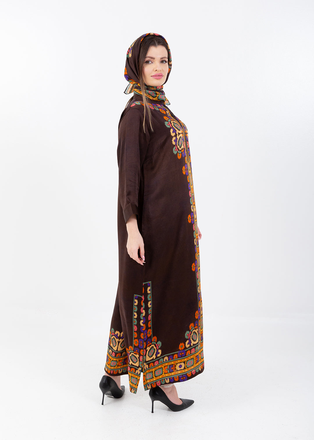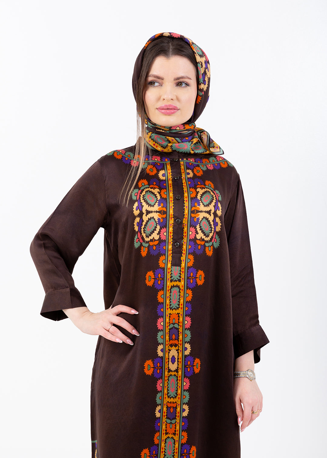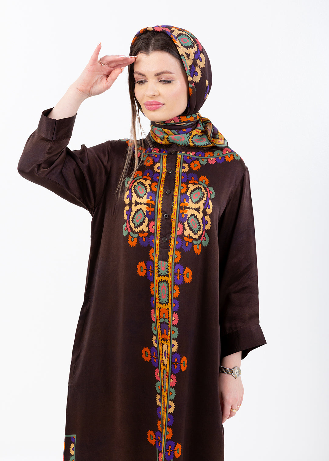 Safiya Deep Brown Cupro Satin Kaftan Set with Matching Scarf