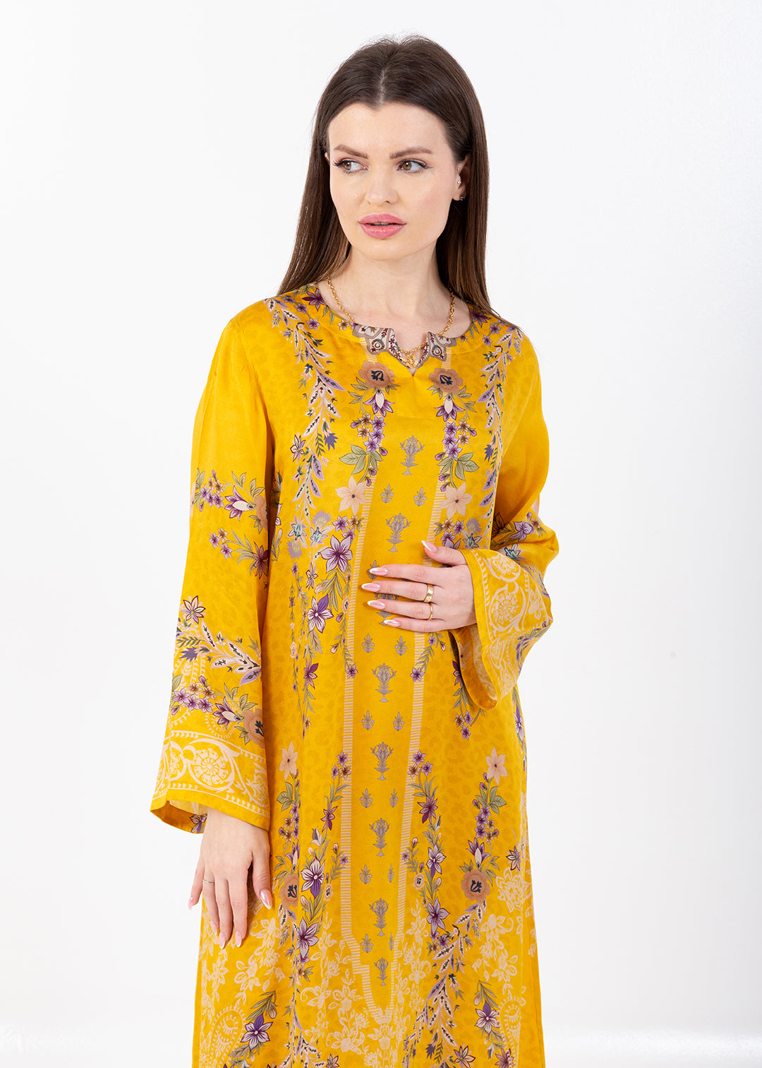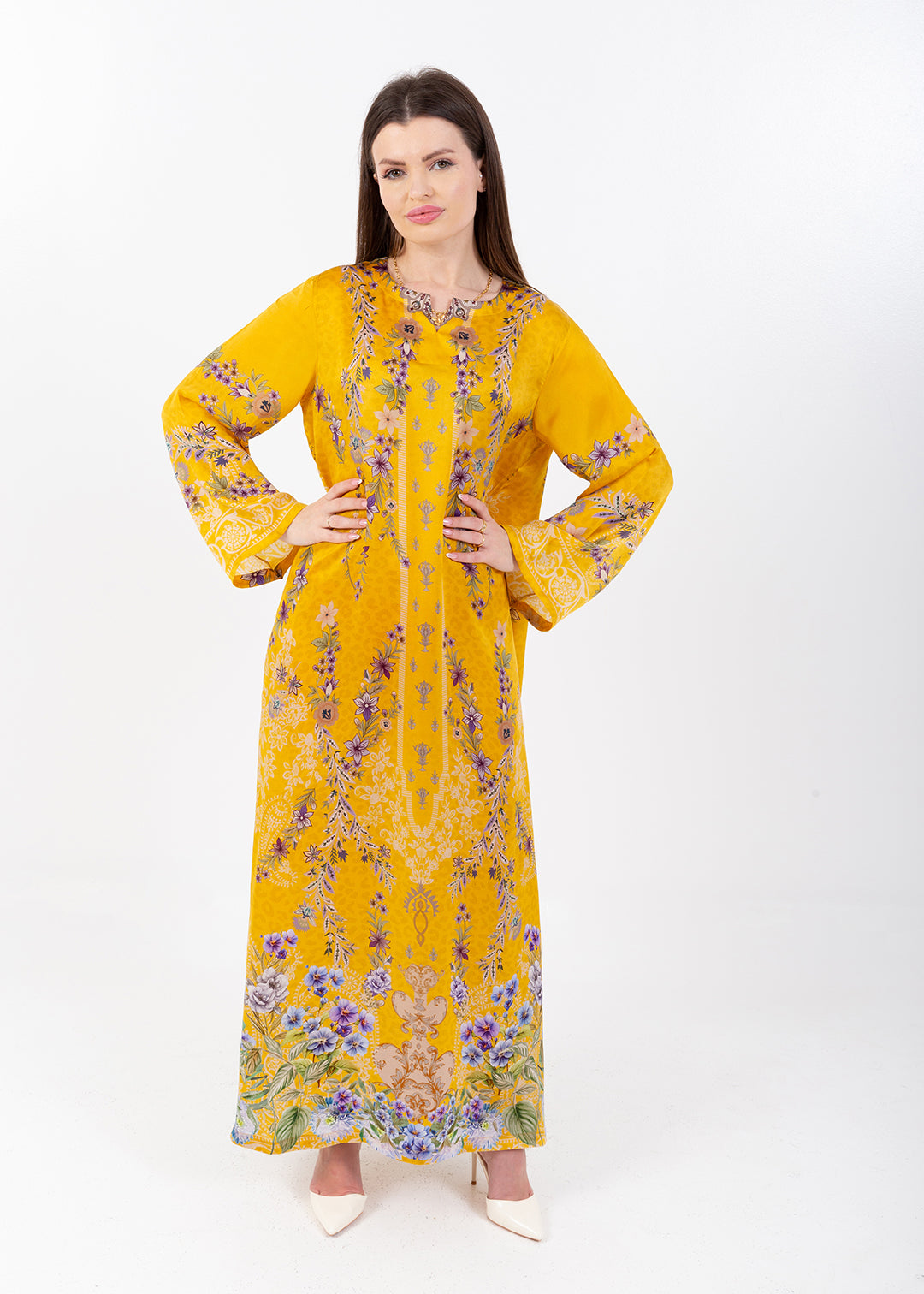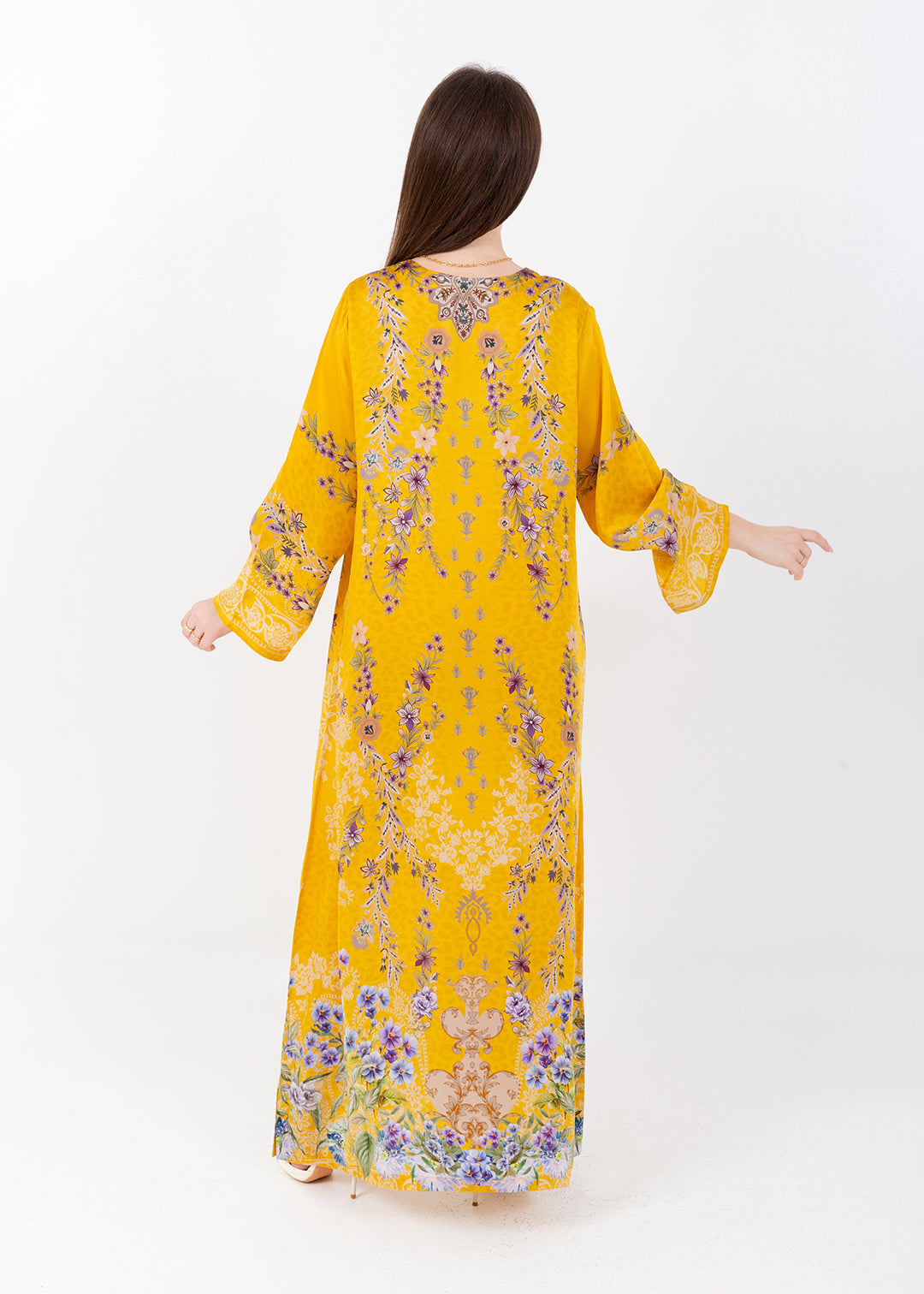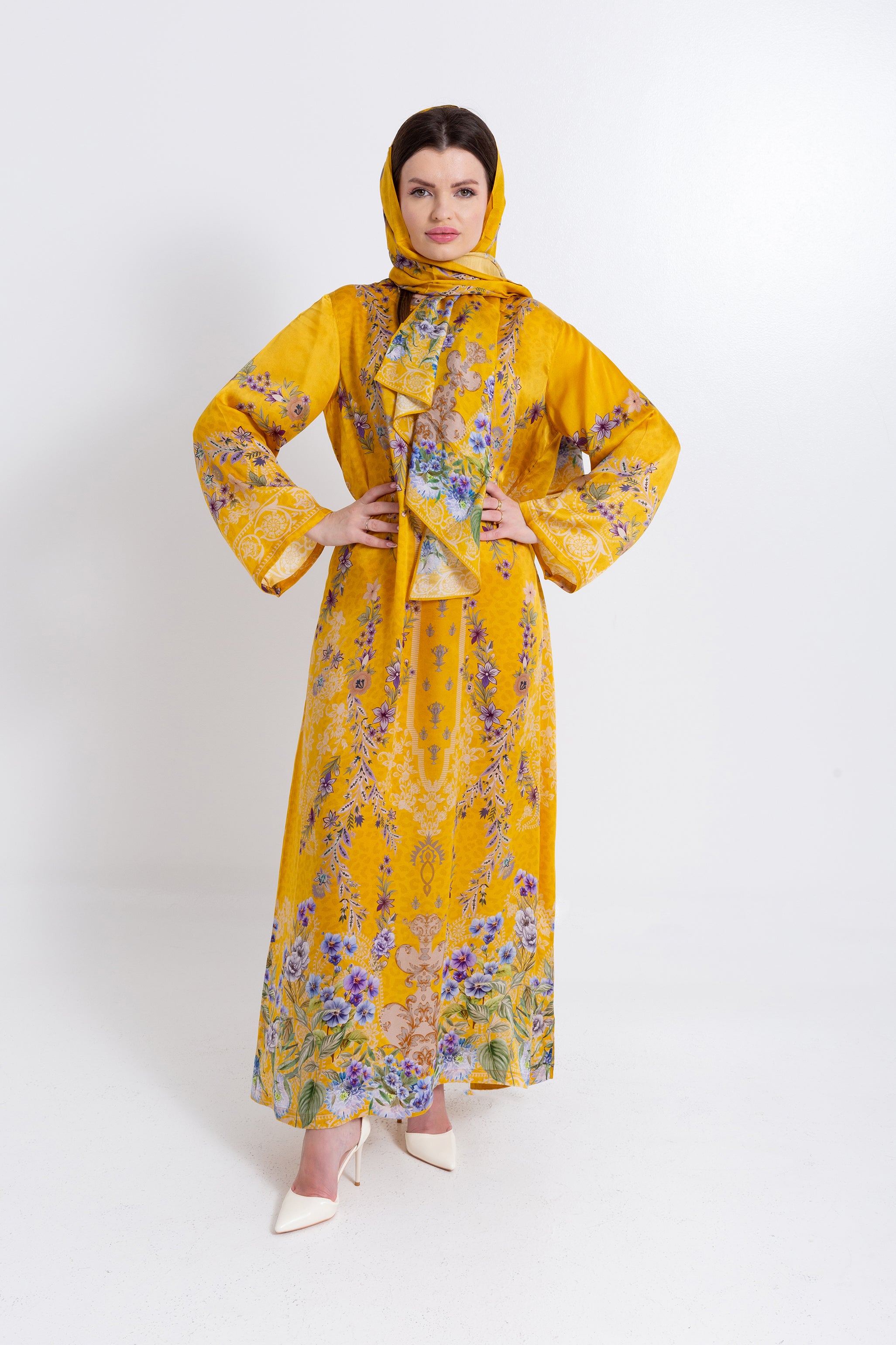 Saira Mustard Bloom Cupro Satin Kaftan Set with Matching Scarf