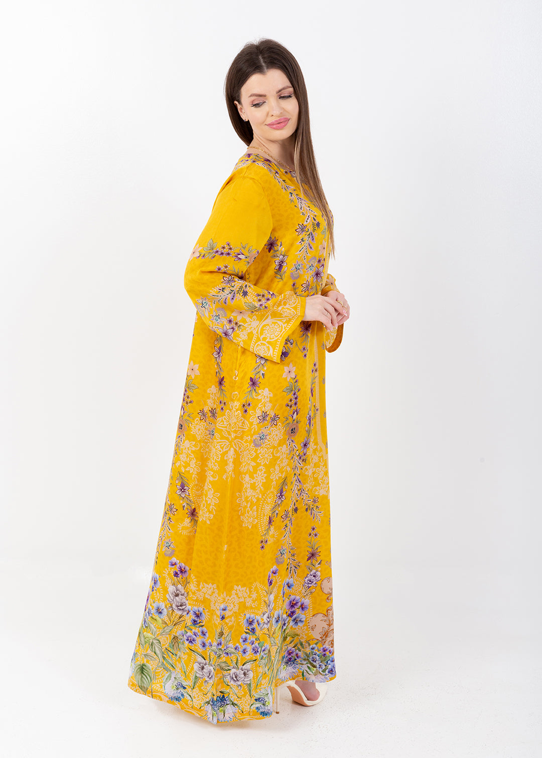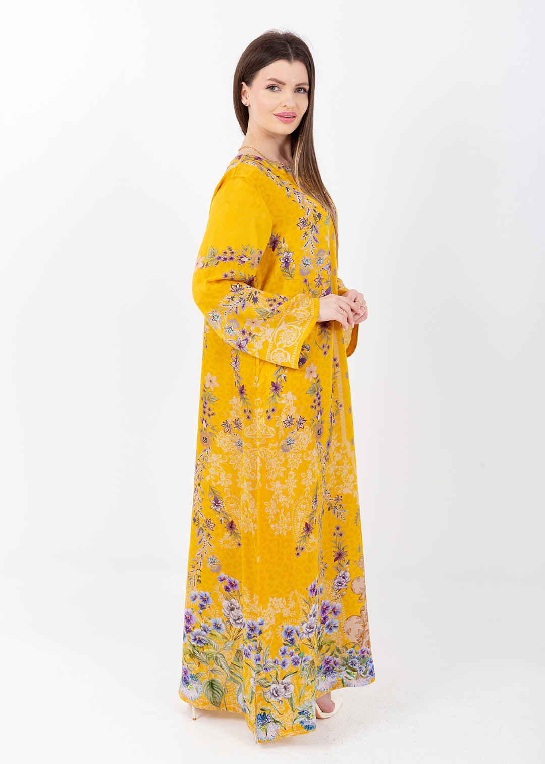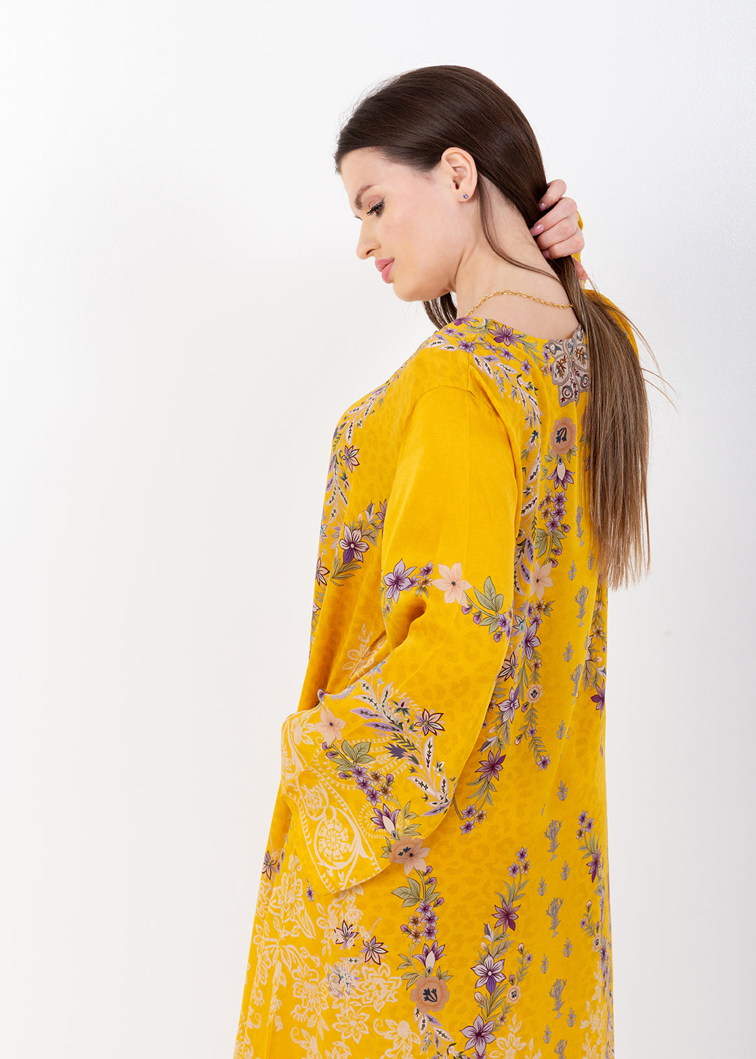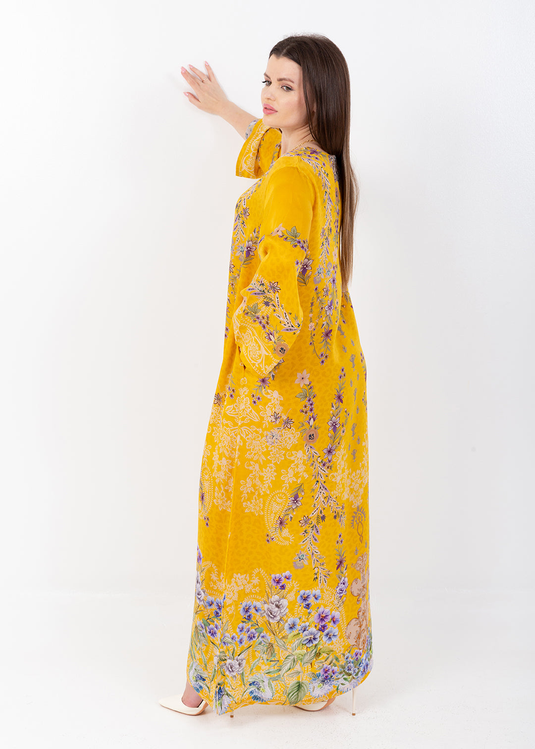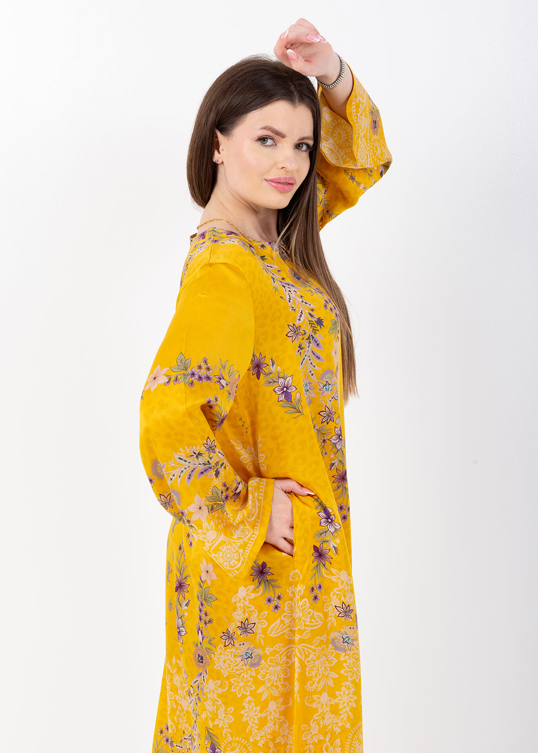 Saira Mustard Bloom Cupro Satin Kaftan Set with Matching Scarf