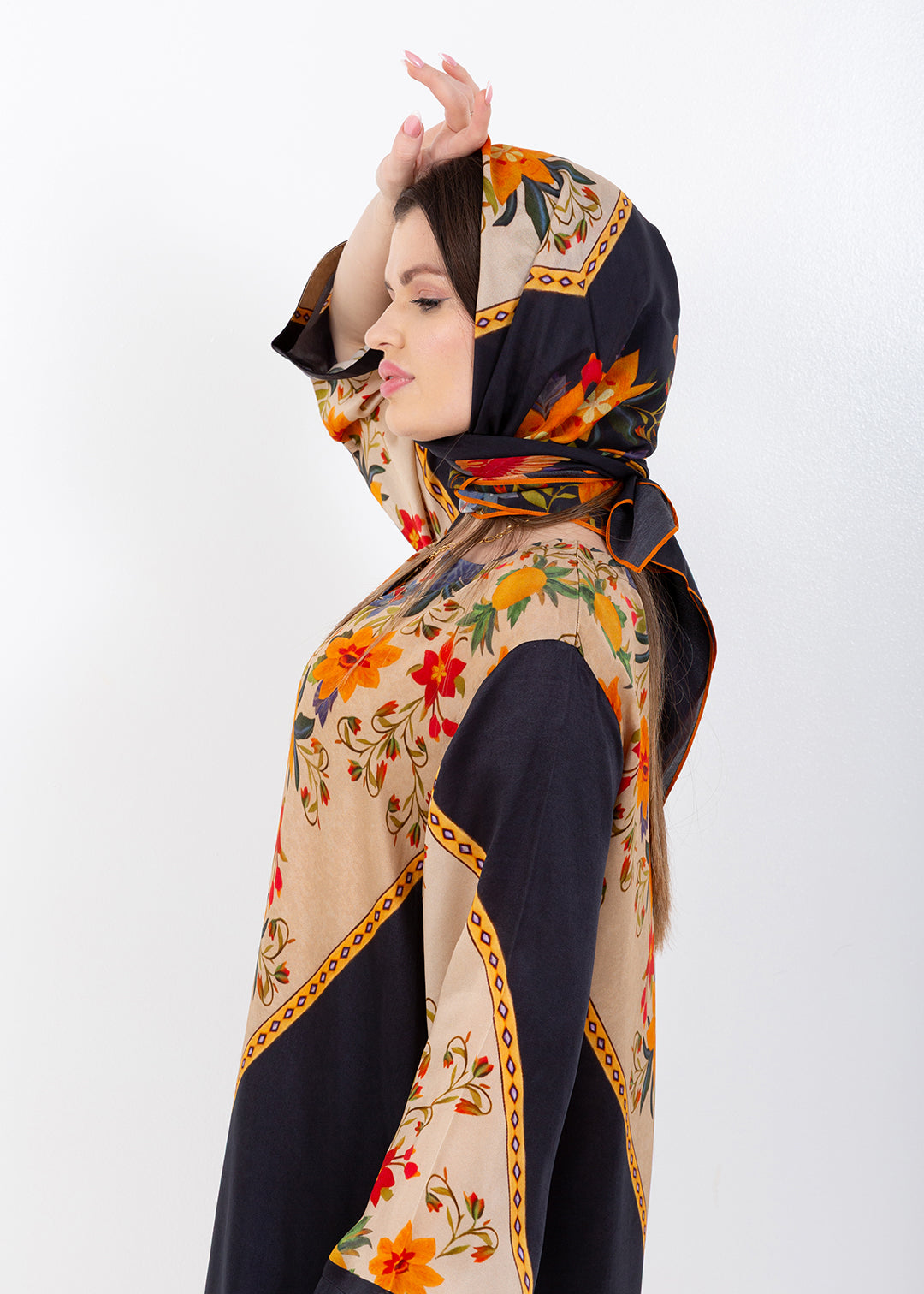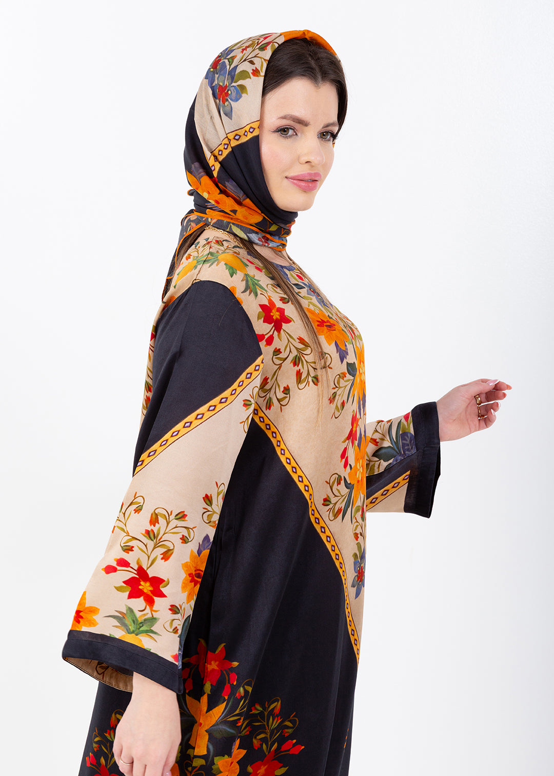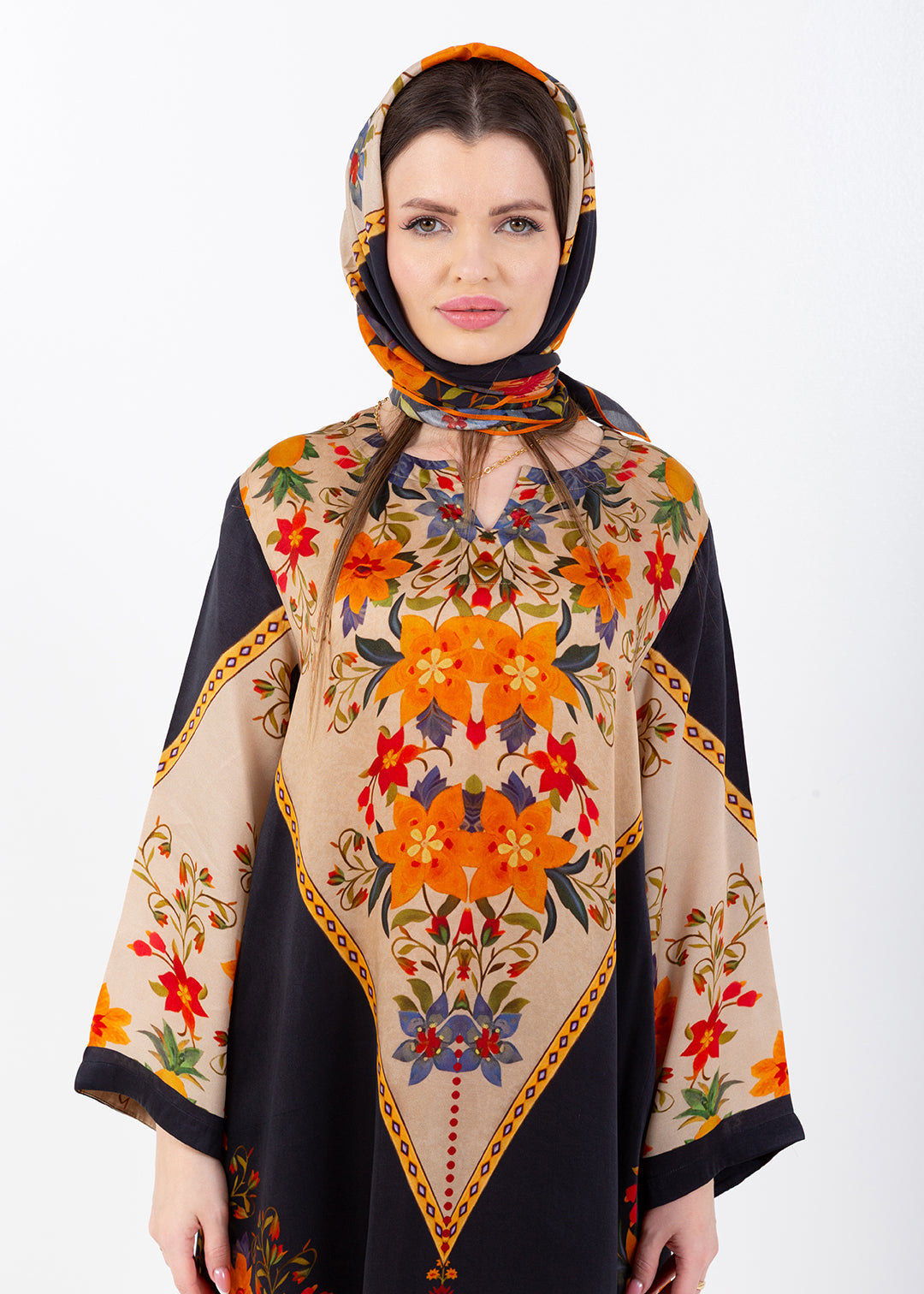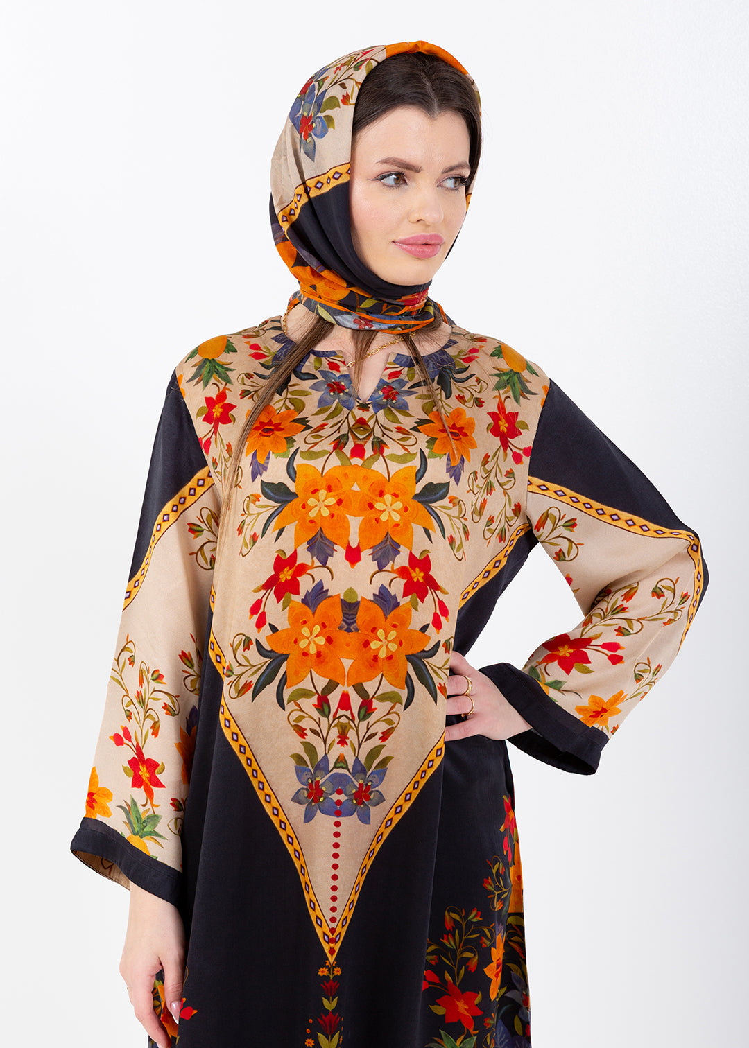 Zaina Black Cupro Satin Kaftan Set with Matching Scarf