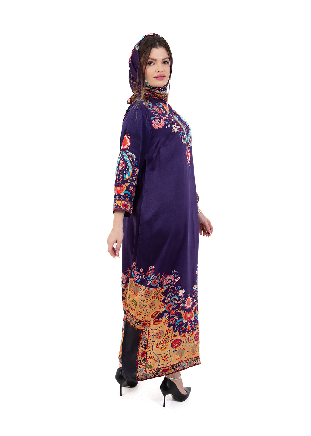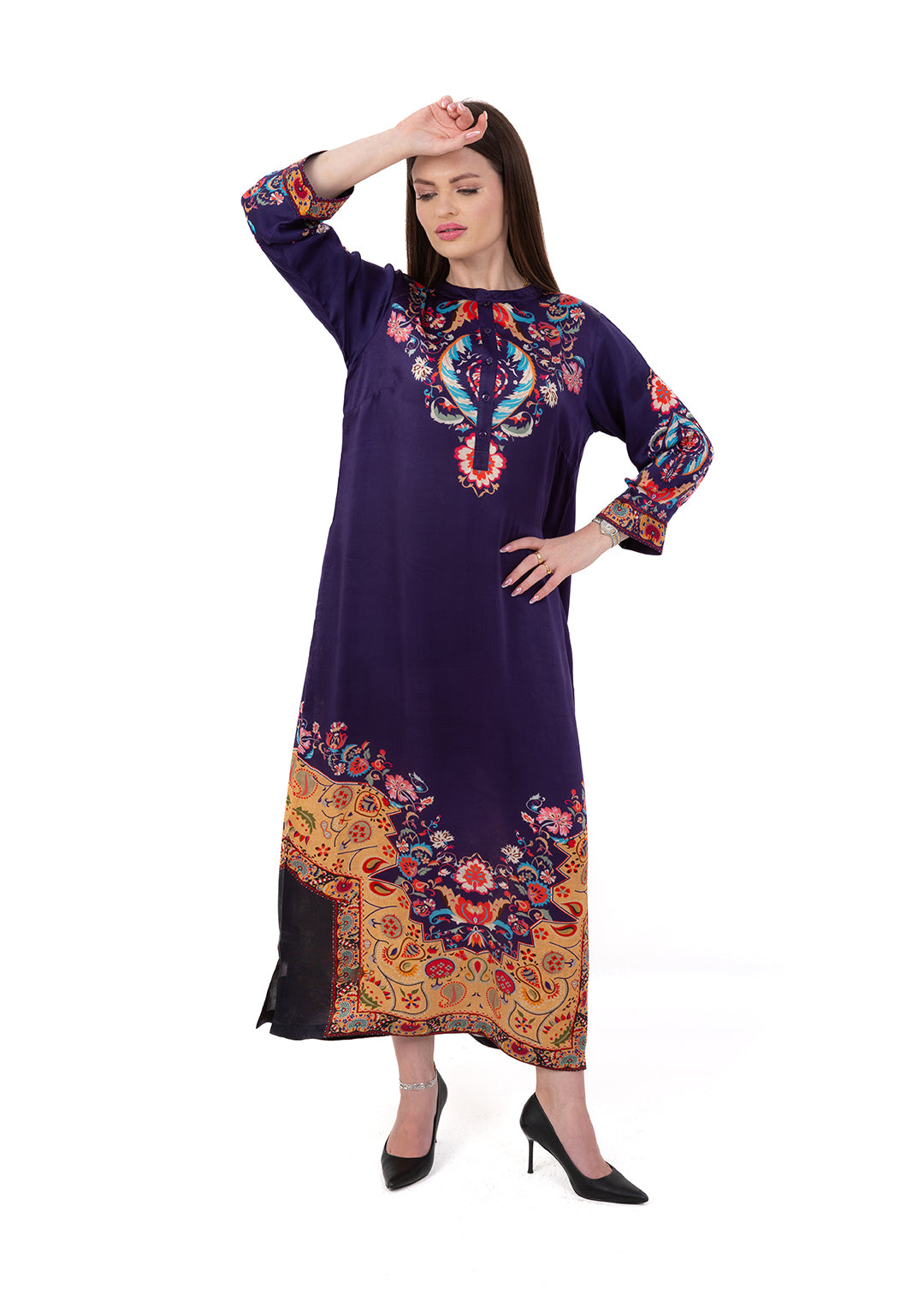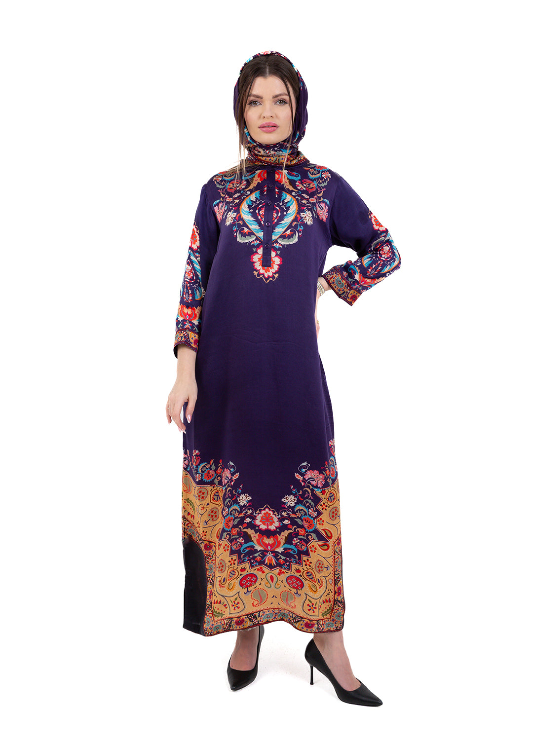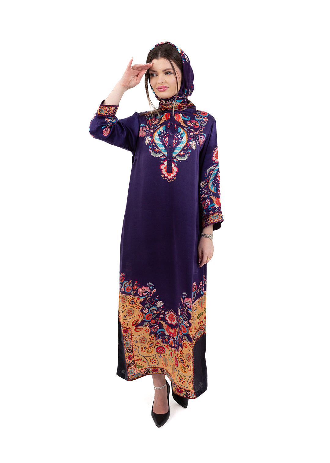 Product Description Bold, elegant, and richly detailed, the Zaria Royal Purple Kaftan Set is crafted from luxurious Premium Cupro Satin, offering a soft,...