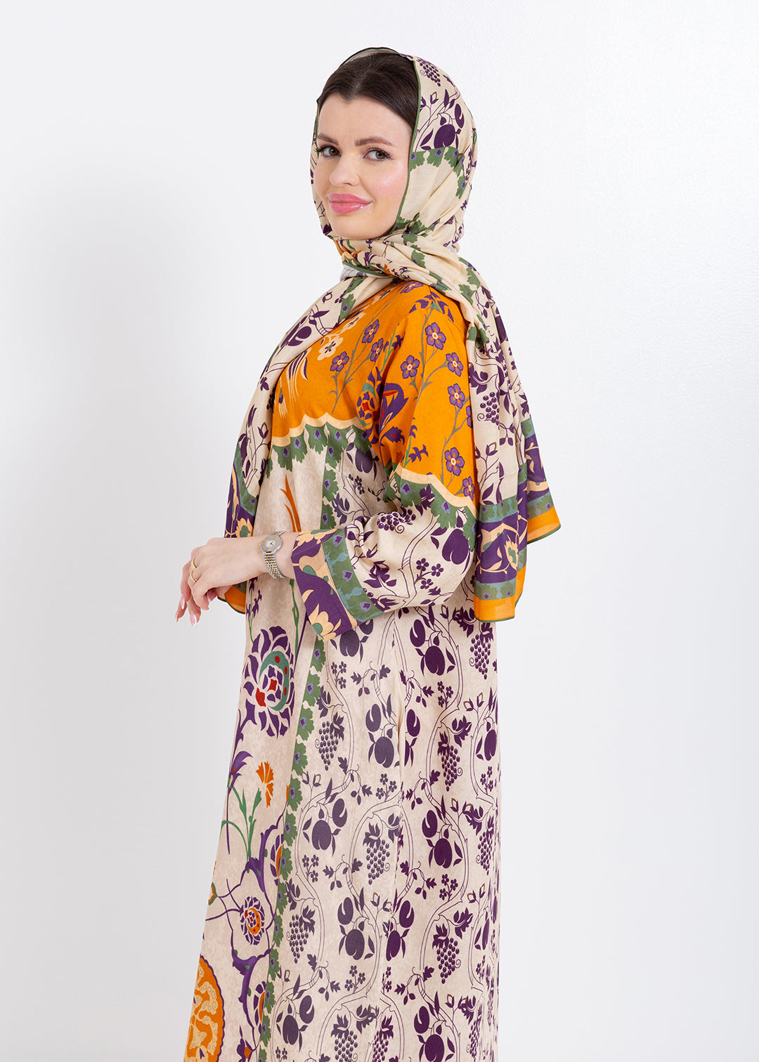 Zoya Ivory Amber Cupro Satin Kaftan Set with Matching Scarf